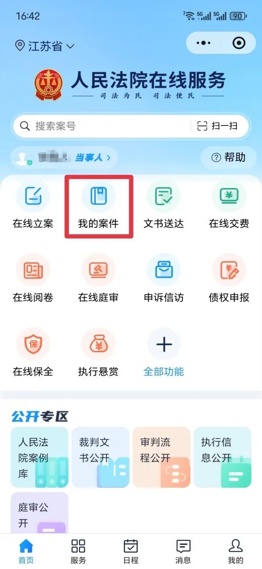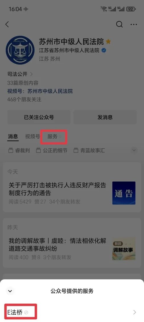 2.搜索并关注苏州市中级人民法院微信公众号,点击服务栏目中平台登录。