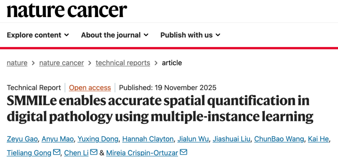 2025年11月19日,西安交通大学李辰教授、龚铁梁副教授联合英国剑桥大学的研究人员(高泽宇博士为论文第一作者),在Nature子刊NatureCancer上发表了题为:SMMILeenablesaccuratespatialquantificationindigitalpathologyusingmultiple-instancelearning的研究论文。