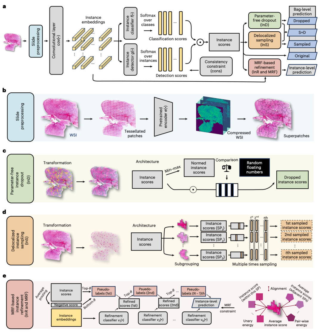 在这项最新研究中,研究团队从数学角度证明,采用实例级聚合的模型能够在不降低全切片图像预测性能的情况下,实现更优的空间量化。然后,研究团队引入了一种基于超级补丁的可度量多实例学习方法——SMMILe,并在6种癌症类型(乳腺癌、肺癌、卵巢癌、肾癌、胃癌和前列腺癌)、3个高度多样化的分类任务以及包含3850张全切片图像的8个数据集上对其进行了评估。
