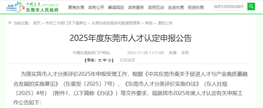 为建立更加科学规范、开放包容、运行高效的人才评价机制,根据《中共东莞市委关于促进人才与产业高质量融合发展的实施意见》(东委发〔2025〕7号)、《东莞市人才分类评价实施办法》(东人社规〔2025〕4号)精神,11月6日,东莞市委人才办、市政务和数据局联合发布了《2025年度东莞市人才认定申报公告》。