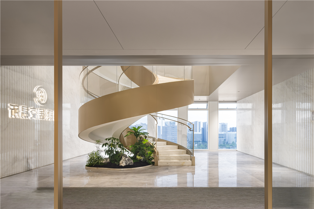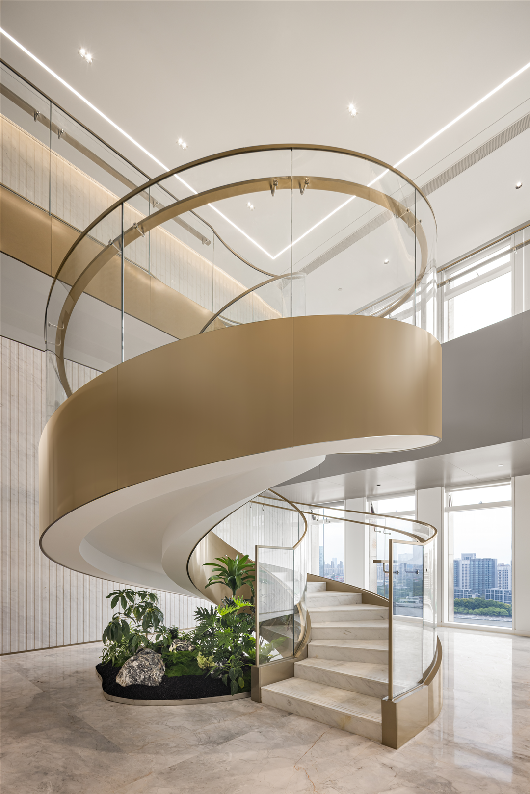 行政决策层位于十四至十五层,汇聚了董事会议室、高管办公室与接待区等高规格功能。空间选用石材、木质与金属等材质,以含蓄的搭配传递出金融办公空间的稳重与气度。连接两层的旋转楼梯不仅解决了竖向交通,更以柔和的造型成为视觉焦点,象征着沟通与连接。董事会议室以深木色调与定制灯光系统强化空间的庄重感,接待区则在中性色调与艺术陈设的烘托下,展现出内敛而适宜的待客之道。