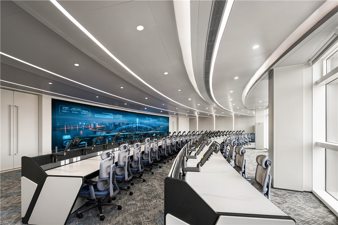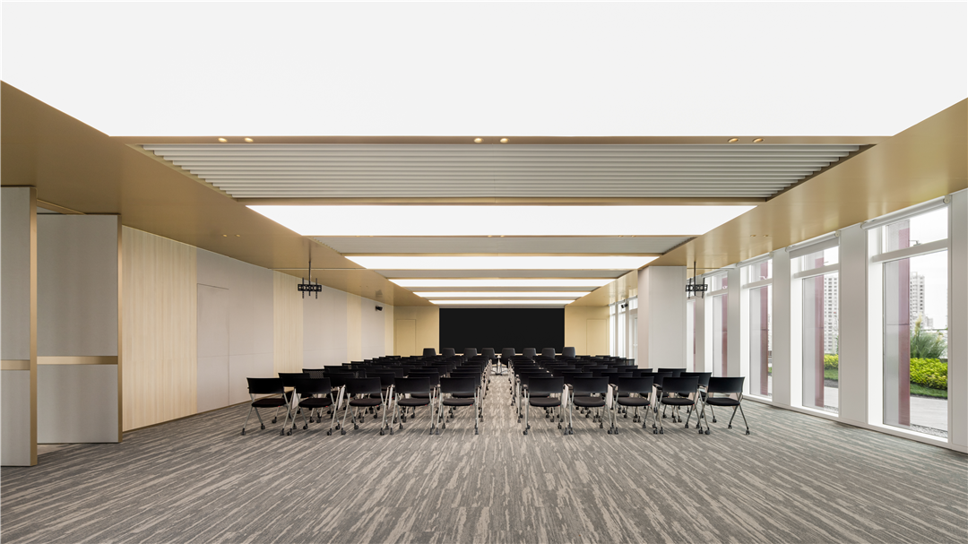 十层作为连接各功能的核心楼层,承载着空中大堂、ECC中控室与报告厅等重要空间。设计以通透开放为主线,将外部露台的景观与光线最大限度地引入室内,形成内外空间的自然对话。ECC中控室以金属材质与浅灰基调营造出理性、科技的氛围,呼应金融数据处理的精确性;报告厅则借助木饰面与线性灯光系统,构建出庄重且适于交流的场所气质。