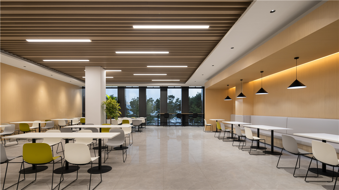 员工餐厅位于二层,以简约大气的设计语言,通过浅色石材、温润木饰面与柔和灯光的搭配,营造出明亮舒适的就餐氛围。合理的功能分区既满足高效用餐需求,又为员工提供了放松交流的休闲空间,展现出金融办公环境中的人文关怀。