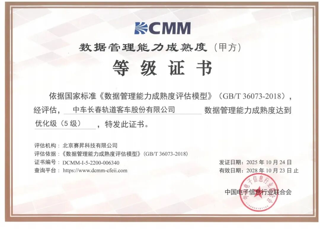 近日,中国中车集团旗下中车长客股份公司正式通过国家《数据管理能力成熟度评估模型》(DCMM)最高等级——优化级(五级)认证,成为轨道交通行业首家获此殊荣的企业,标志着中车在数据管理能力上达到国内先进水平。