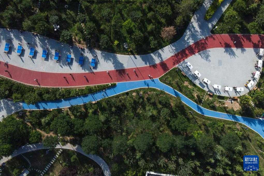 2025年7月7日,市民在平凉市崆峒区中心城区的平凉城市活力公园休闲健身(无人机照片)。新华社发(吴希会摄)