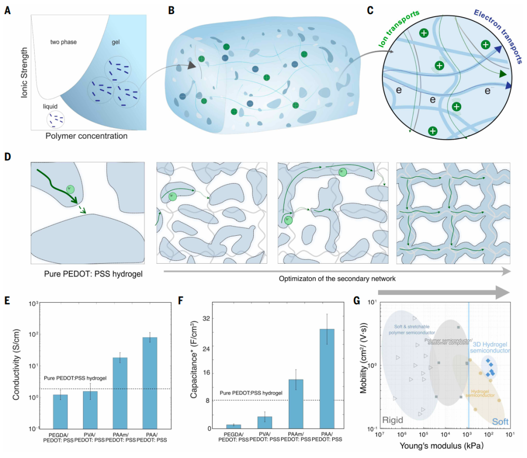相工程确保形成连续的PEDOT+相,为电子传输提供“高速公路”。通过引入聚丙烯酸(PAA)作为次级网络,导电率从0.9S/cm提升至100S/cm,提高了超过两个数量级。