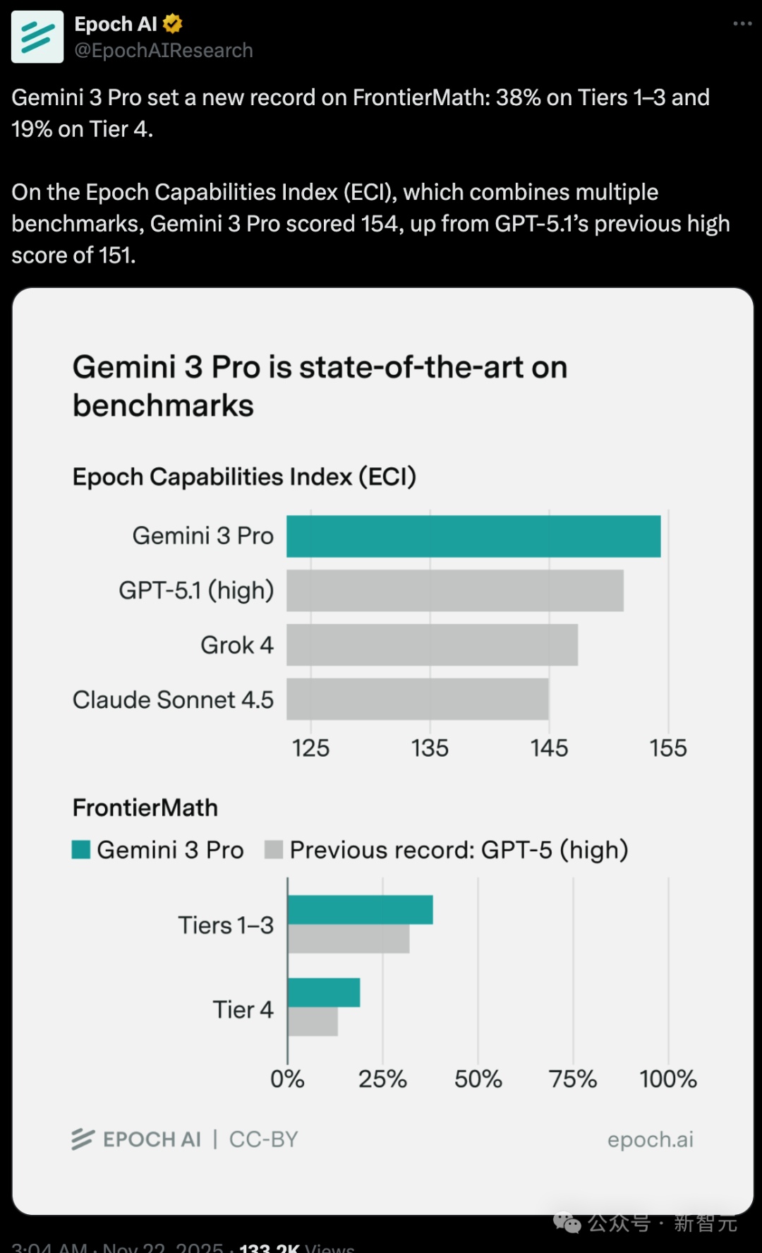 在综合多项基准测试的Epoch能力指数(ECI)中,Gemini3Pro获得154分,超越了GPT-5.1此前保持的151分的最高纪录。
