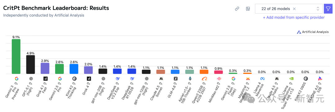 不过,虽然登顶了CritPt,Gemini3Pro的成绩也才有9.1%,与满分表现还有些距离。