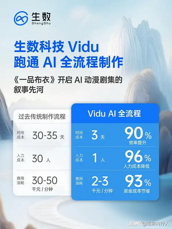 跟传统做法比起来,《一品布衣》AI 全流程效率有了颠覆性的变革!单集制作周期从 30-35 天缩到 3 天,效率提升超 90%;单分钟制作成本从 3-5 万降到 2000-3000 元,省了 93% 多!