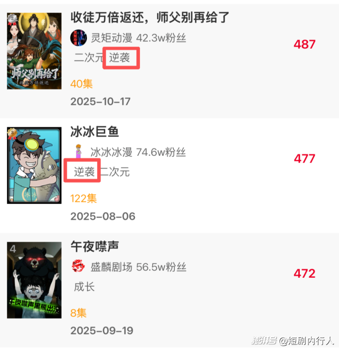 现在市场上逆袭、玄幻仙侠题材占比超过 70%,剧情套路高度雷同。而曾经火爆的沙雕漫占比却在持续下滑,职场、校园、悬疑等多元题材还没有形成规模,难以满足观众日益多元的审美需求。