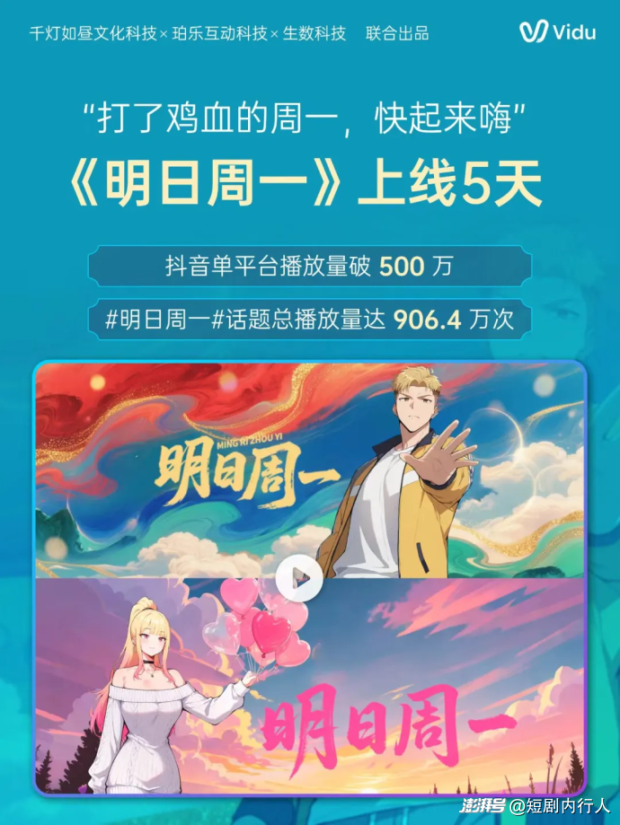 漫剧《明日周一》堪称“速成流”的标杆之作,由千灯如昼文化、珀乐互动与生数科技联合出品。10 人团队仅花 45 天就啃下 50 集内容,上线抖音 5 天单平台播放量直接破 500 万,#明日周一 话题总播放量更是冲至 906.4 万,把“多参宗”的效率优势玩到了极致。