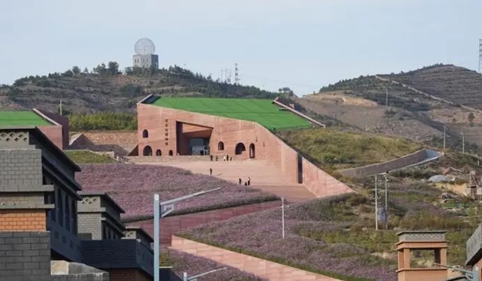 博物馆设计借鉴当地传统的窑洞民居,采用覆埋的方式,形成冬暖夏凉的室内环境,建造过程中大量使用了现场开凿的石材,如近旁的石窑洞,让建筑与场地环境有效融合。