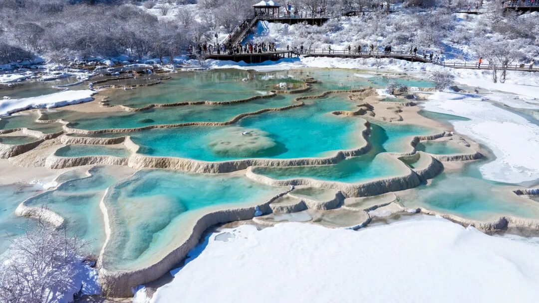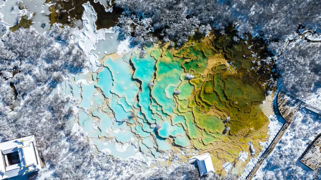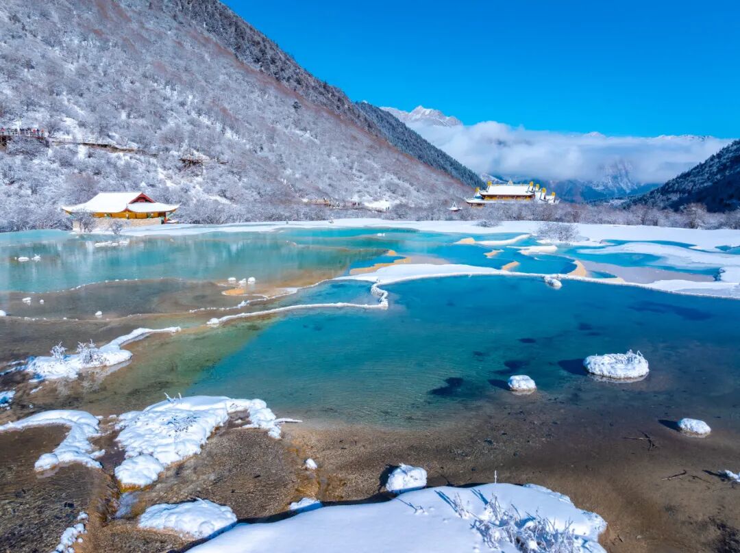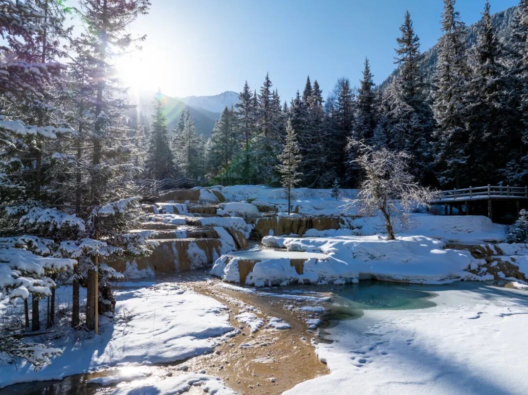 黄龙的冬,是大自然执笔的绝美画卷。雪覆林海,似给群山披上银纱,阳光穿透枝桠,在钙华滩上洒下碎金。那层层叠叠的彩池,如翡翠镶嵌在雪原,蓝绿交辉间,古建与雪山遥遥相望,每一步都是仙境的邀约,每一眼都是时光的惊艳。