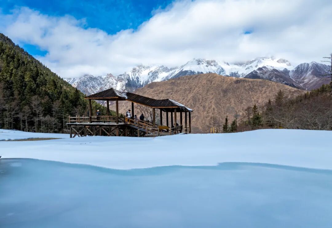 当雪落黄龙,世间便有了诗意的模样。钙华池在冰雪中晕染出梦幻色泽,或如宝石剔透,或似绸缎流转。林海皑皑,亭台古朴,雪山在云雾里若隐若现,仿佛天地在此刻按下了静音键,只留这冰与彩的交响,在川西的秘境中,演绎着极致的浪漫与清绝。