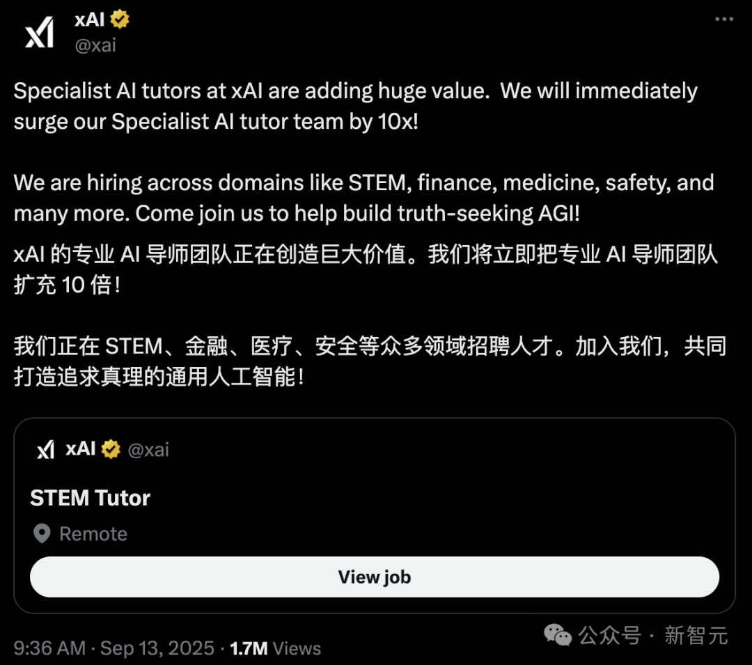 这也正是xAI宣布将其专业AI导师团队立即扩容10倍的真正原因。