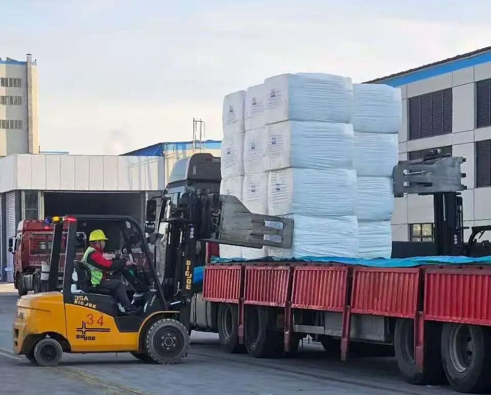 近日,在高新区赛得利(盐城)纤维有限公司仓库里,打包整齐的超细纤维素纤维堆叠如山,等待装车;仓库外,4辆大型货车早已列队等候,2辆叉车穿梭往返,将刚下线的纤维包运上货车,即将发往全国各地。