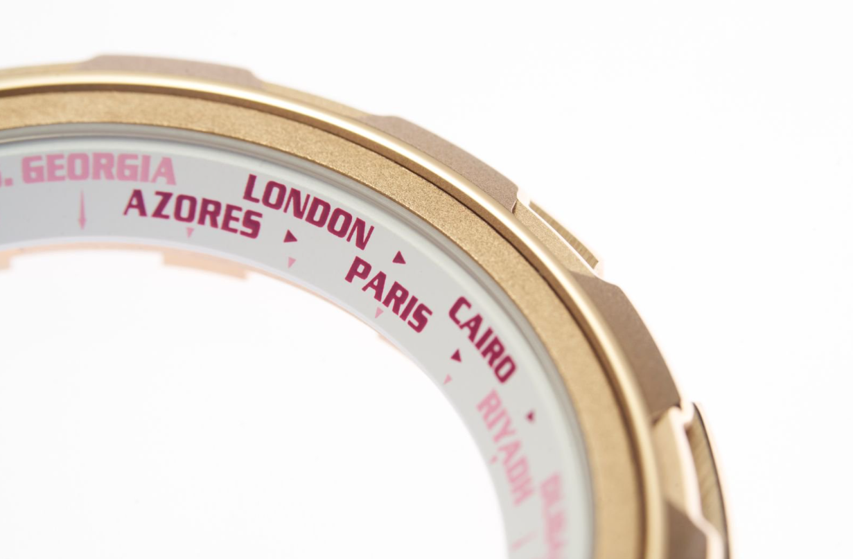 这种“化繁为简”的背后,是极其复杂的机械结构。品牌机芯与表壳工程师通力协作,将一套精密的齿轮机构集成于表圈内部,与机芯的时针轮联动。为了实现这一功能,三件式表壳内含106枚零件,其中12枚专为驱动世界时表圈而生。为了确保其耐用性,这套系统历经了超过5000次完整旋转测试。