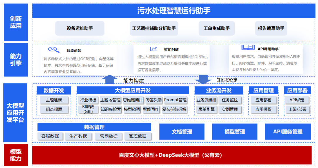 基于通用大模型的智慧运行助手。采用通用大模型(LLM模型)建立智慧运行助手,形成一个虚拟的“全能型”污水处理技术人员,可为工艺人员提供工艺调控优化建议,为设备管理人员和安全管理人员提供精准的专业知识。