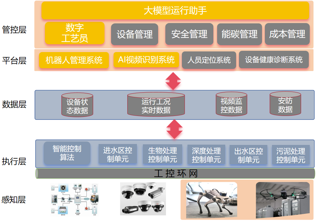 基于具身智能的智能感知体系。在生产现场增加无人机、机器狗、具身机器人、无人船替代人进行现场巡检,通过具身智能的应用,以图像、声音等多维度的感知模式实时获取仪表读数、人的行为、工艺运行状态以及设备状态。同时,建立视频AI识别平台,将上述视频统一接入到该平台中,通过基于深度学习算法的视频识别模型自动识别抽烟、摔倒等动态安全风险以及生物池曝气状态,二沉池跑泥情况等工艺运行状态,实现替代人自动感知现场生产情况,大幅提高感知的时效性和连续性。
