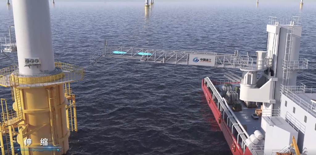 该波浪补偿栈桥适用于专业运维母船及改造船舶,采用顶靠和悬停双搭接模式,无需改造风电桩落点结构,即可根据接触面形态灵活切换对接方式,这一模式打破了传统栈桥场景适配单一的局限。