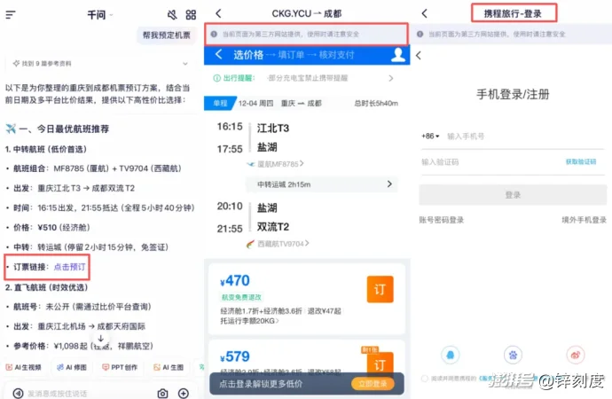 现在,用户只要根据自己的需求发出具体的指令,比如“规划到成都的出差行程”,AI助手就能迅速理解并执行,为用户提供相应的出行方案。用户甚至还能跟随前面的对话,下达如“订购机票”这样的次一级指令,进而得到航班推荐及预定下单的入口。相当于以千问这个AI助手为入口,可以关联到携程等第三方站外平台,从而为用户开启一场无缝衔接的旅行规划与预订体验。