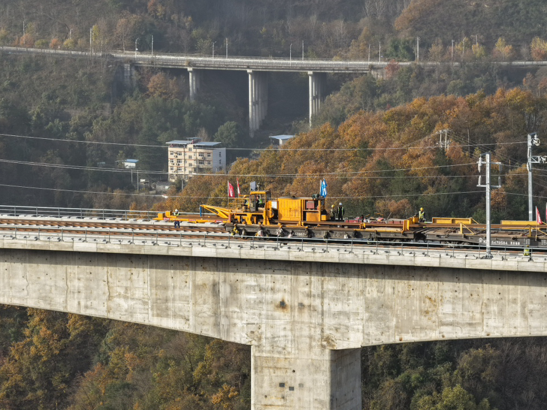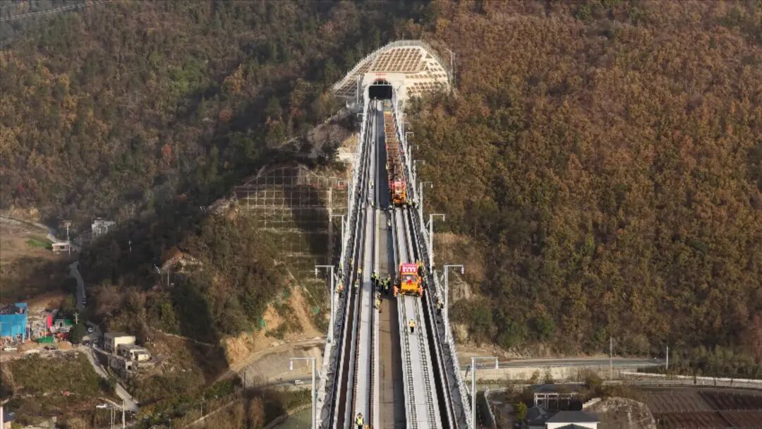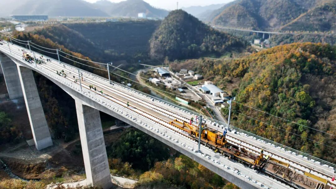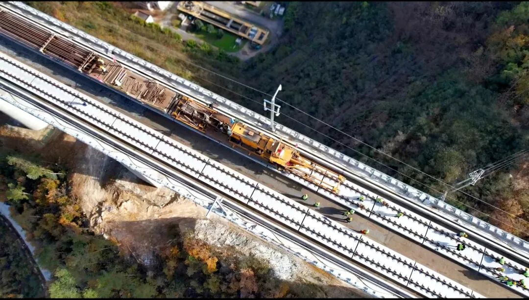 西十高铁穿越秦岭山脉,桥隧比高达95%,涉及长大坡道铺轨地段14处,最大坡度比达25‰。自今年9月8日全线铺轨正式启动以来,建设单位不断优化施工工艺,统筹资源配置,成功攻克多项复杂工况难关。