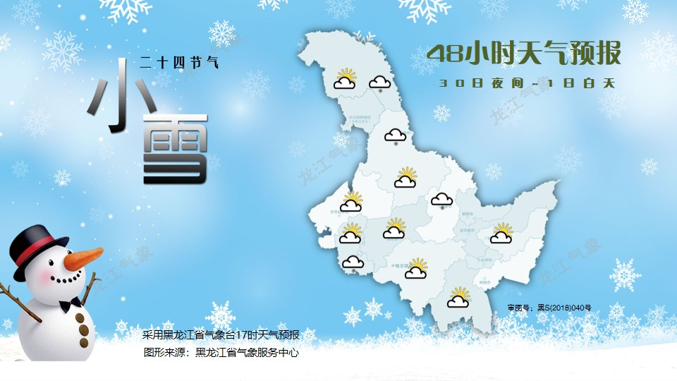 30日白天最高气温:大兴安岭北部-18~-16℃,大兴安岭南部、黑河、齐齐哈尔北部-14~-12℃,大庆南部、哈尔滨、牡丹江-5~-3℃,其他地区-8~-6℃。
