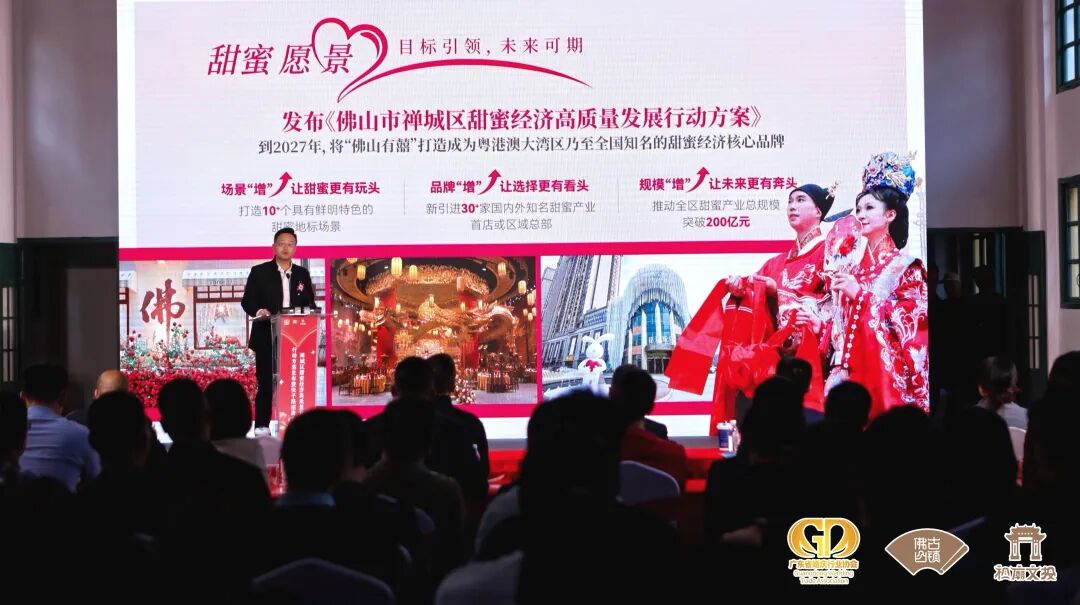 禅城区祖庙街道党工委书记、办事处主任梁劲钊为行动方案作精彩推介,他介绍道:“佛山古镇,不仅是历史名城,更是一座‘甜蜜之城’,其独特的‘甜蜜底色’,深植于集体记忆的婚俗文化底蕴,正是禅城区发展甜蜜经济最坚实的根基。”