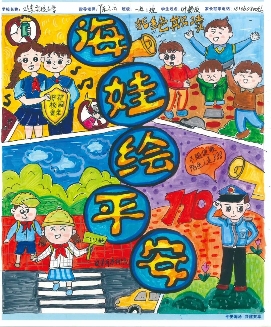 “这是我画的《海娃绘平安》——你们看这边,两个同学举着‘守护校园安全’的盾牌,就像咱们班的安全员,总帮大家盯着走廊里的小磕绊;再瞧那边,几个小伙伴正一起摆手,这是在说‘不可以欺凌同学’,不管是谁遇到难处,咱们都要一起帮忙;还有这个小提示牌,写着‘不能随便跟陌生人走’,是老师反复提醒的安全小要点;最后这个穿警服的叔叔,是常来学校讲安全课的警察叔叔,他说会一直守着咱们的校园!我把这些每天学到的平安小常识都画进来,就是想让大家一看这幅画,就能记牢怎么保护自己啦!”