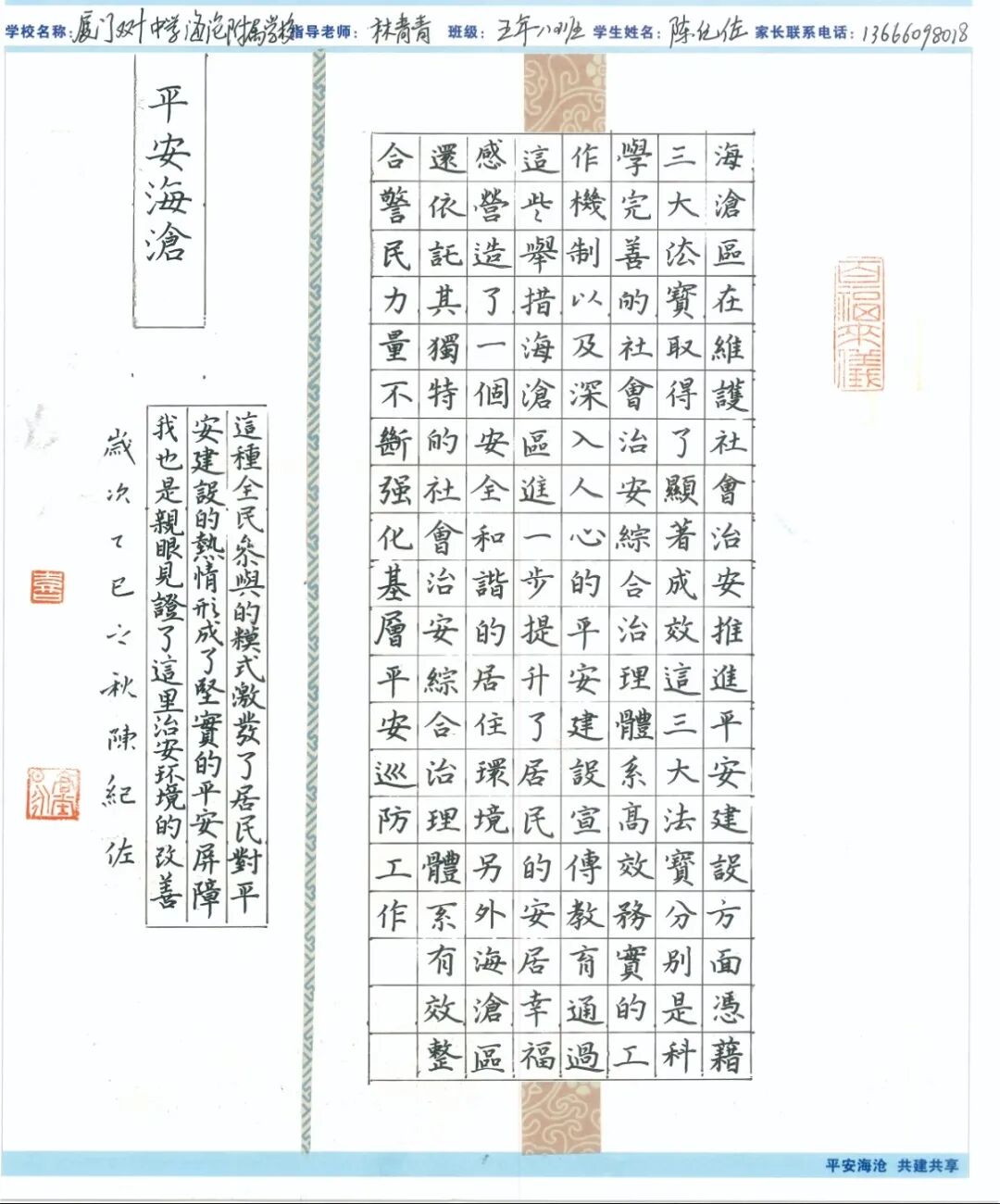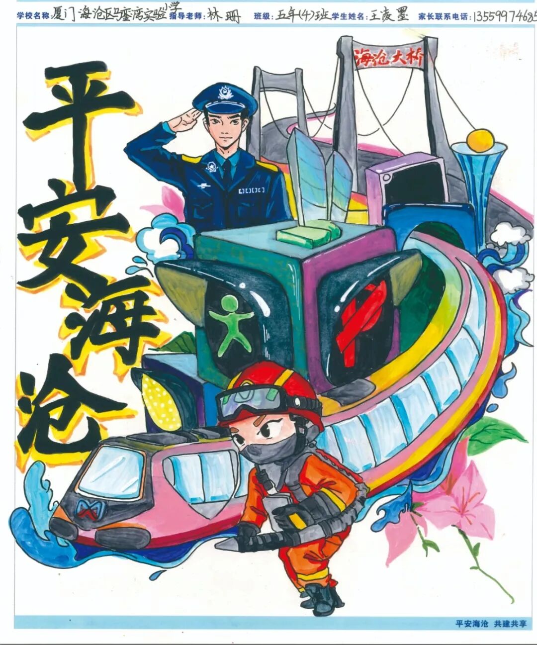 “我画的是交警叔叔在校门口站岗守护我们安全,那天风很大,交警叔叔早早已经守在校门口了。”海沧延奎实验小学芸美分校六年(2)班胡芷溱的作品,被选入巡展的“平安海沧奖”;而厦门市海沧区马銮湾实验小学叶越杏拍摄的《志愿服务队,守护成长》,记录了志愿者守护孩子们过马路的画面,“孩子们从横穿马路到在志愿者的指导下有秩序地走在斑马线上,正是安全意识发芽的过程。”