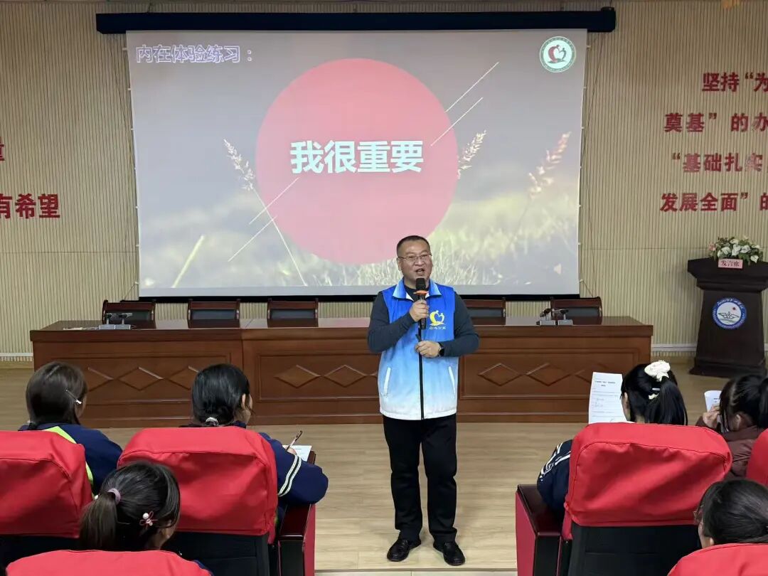 下半场,以《重启系统自信前行》为主题,赋能初三学生调整心态为自己的人生理想奋进。辅导中主要通过视频赏析、心理故事、冥想体验、互动交流等方式进行,引导孩子们看到我的重要性和价值观,从而提升内在力量树立自我信心。从79岁走上T台的王德顺励志故事,到“心中的两头狼”心理寓言,再到“我很重要”的互动练习,同学们逐渐领悟到:“自我选择、自我负责、自我成就”才是成长的根本逻辑。辅导现场设置了丰富的体验环节,这些环节的设置只在生动传递出“勇往直前、踏实付出、合作共赢”的成长理念,也在努力给孩子们种下一颗积极向上的生命种子。