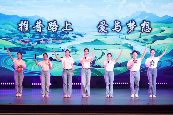 节目《推普路上 爱与梦想》回顾了学生录制《新疆最美家庭典型事迹》登载“学习强国”,以及深入学校、乡村推广普通话的历程。自2023年9月启动的“伴学推普 牵手共读”数字音频帮扶项目持续助力新疆妇女儿童学习普通话,书写了新时代青年传承中华优秀传统文化、铸牢中华民族共同体意识的使命与担当。
