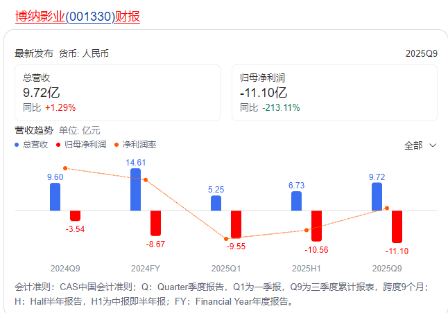 股价起不来,对应的是博纳营收方面的低迷,从2022年到2024年,博纳一共亏损了15亿,今年前三季度又亏损了11.1亿,不到4年时间共亏损26亿。