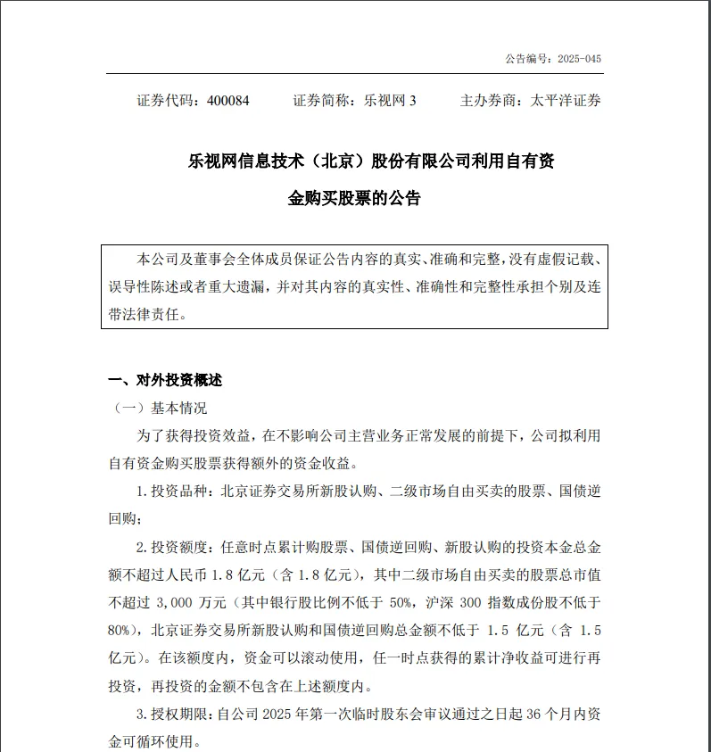 12月2日晚间,已退市至股转系统交易的乐视网(400084.NQ)披露,为了获得投资效益,在不影响公司主营业务正常发展的前提下,拟利用自有资金购买股票获得额外的资金收益。