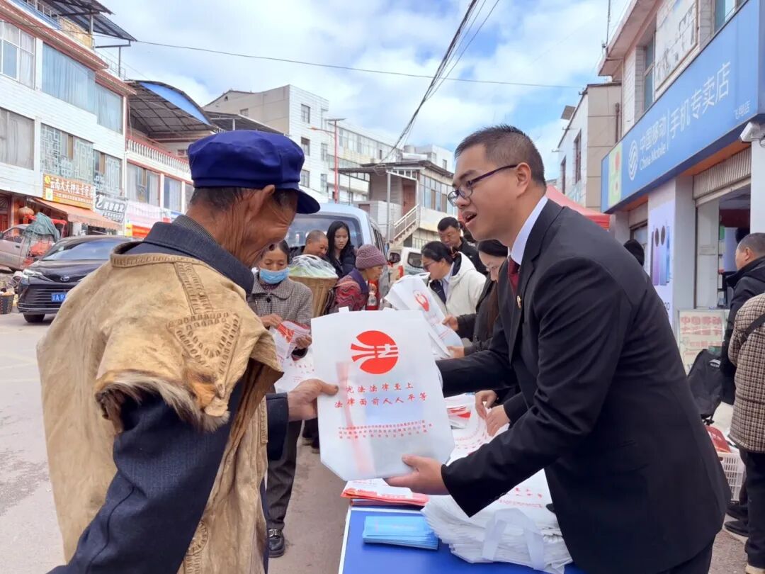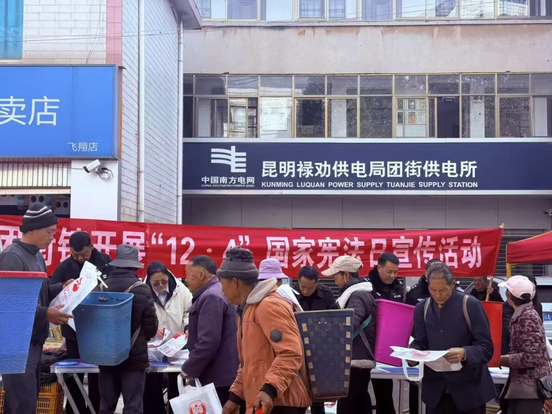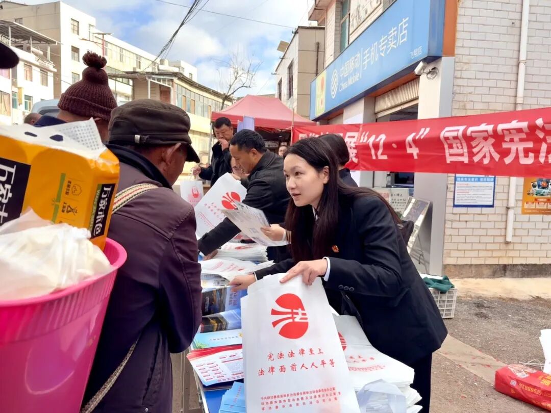 初冬的暖阳洒在熙熙攘攘的团街集市上,让让沾满烟火气的街巷、笑盈盈的脸庞,格外温暖。12月4日,以国家宪法周为契机,团街法庭巧妙利用街天赶集人流聚集的黄金时段,将普法宣传的“摊位”摆到群众身边,开展了一场集精准、联动、实用于一体的“沉浸式”宪法宣传活动,为乡村法治建设注入鲜活暖流。