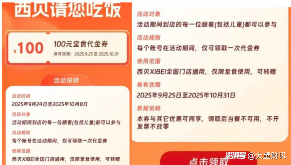 或是为了挽回消费者的信心,西贝推出了一系列堪称夸张的营销。2025年9月24日至10月8日,全国门店启动“消费即赠百元无门槛代金券”活动,消费者甚至可通过购买4元馒头领取代金券,叠加折扣后甚至可以接近“零成本用餐”。