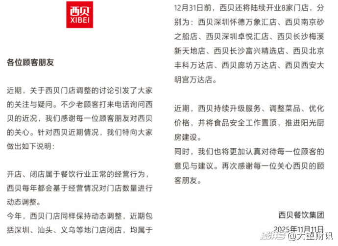 面对闭店质疑,西贝官方声称“属于行业正常动态调整”,并宣称“12月31日前将新开8家门店”。