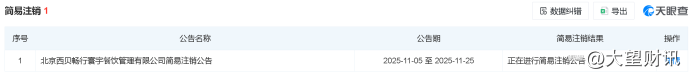 天眼查信息显示,西贝旗下北京西贝畅行寰宇餐饮管理有限公司也于11月5日启动简易注销程序,公告期至11月25日。