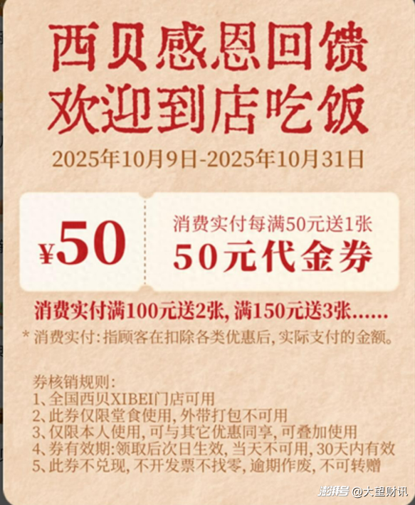 2025年10月9日西贝的活动刚结束,又推出“满50元送50元券”的接力活动,这些促销活动虽短期带来了排队潮,部分门店出现“消费205元实付5元”的极端情况。