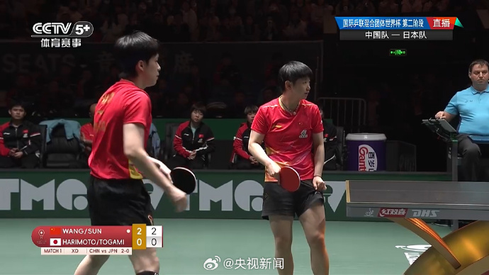 首场混双比赛,王楚钦/孙颖莎3-0战胜户上隼辅/张本美和,三局比分为:11-4、11-6、11-5。中国队大比分3-0领先。