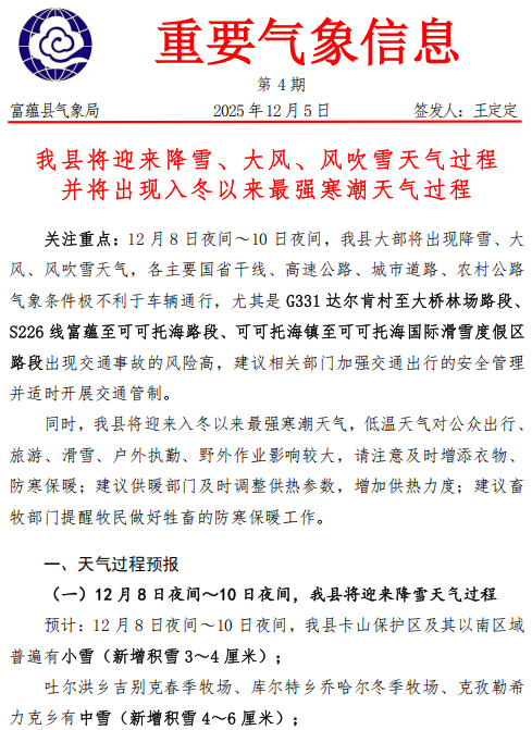 富蕴的冬季别具风情,雪景壮丽,但安全与温暖是享受这一切的前提。请您务必重视此次寒潮过程,提前做好准备。祝您在富蕴的旅程,即便在寒冬中,也能收获一份独特而温暖的记忆!