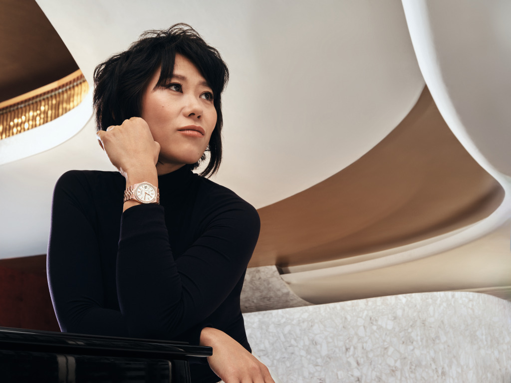 王羽佳佩戴着18K永恒玫瑰金款陆使型 36腕表,搭配镶钻外圈。 © Rolex/Rory Payne