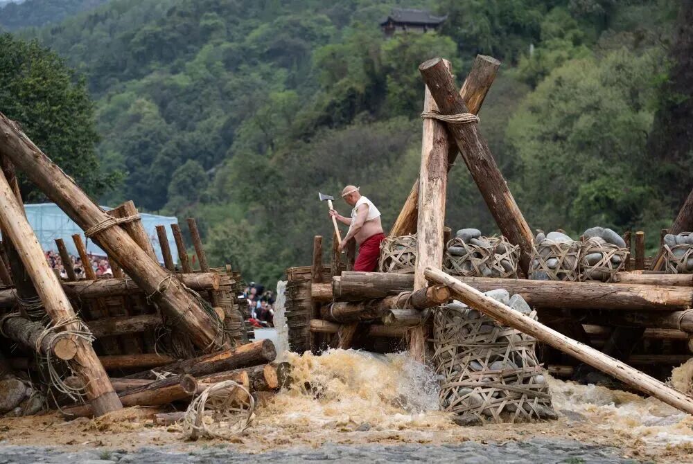 2024年4月4日,在2024都江堰放水节上,壮年堰工举起利斧砍杩槎。新华社记者江宏景摄