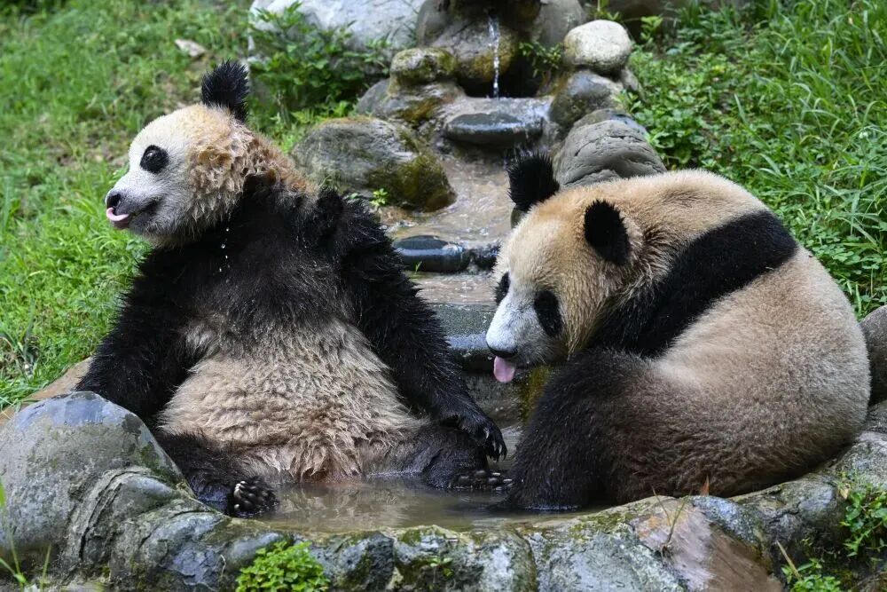 2022年8月18日,中国大熊猫保护研究中心都江堰基地的大熊猫在圈舍的水池里戏水玩耍。新华社记者沈伯韩摄