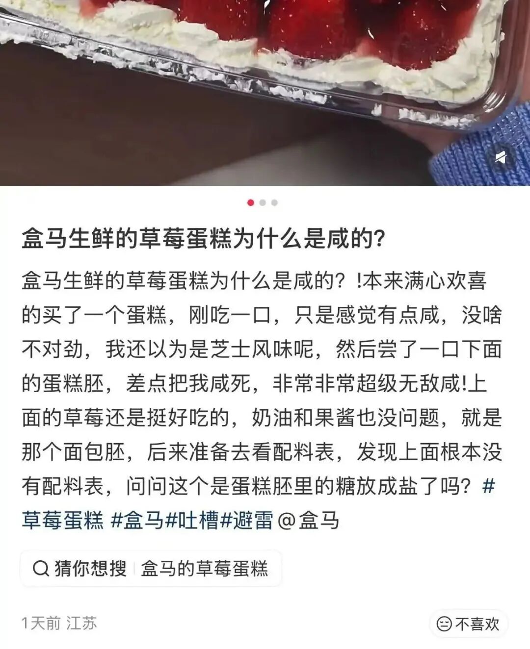 盒马热门甜品草莓蛋糕口感异常