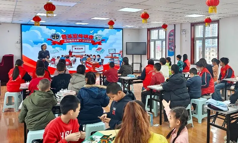 乌鲁木齐市天山区司法局和平路司法所联合三山社区开展“携手童行 法护成长”普法宣传活动。受访单位供图