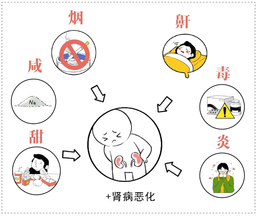 武汉大学人民医院肾内科梁伟教授有着丰富的肾科工作经验,他将平时指导肾友预防肾衰竭的注意事项浓缩为6个金句:甜、咸、烟、鼾、毒、炎!