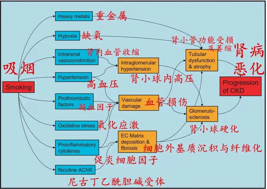 香烟中含有尼古丁、镉、铅等大量肾毒性物质,导致血压升高、肾小球内高压力、内皮细胞损伤等,长期接触会引起肾病恶化。