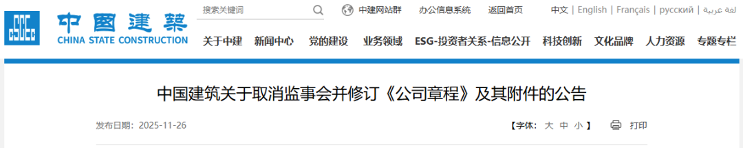 2025年建筑行业改革驶入深水区,中国建筑的一系列动作引发行业聚焦。11月26日,中国建筑股份有限公司(以下简称“中国建筑”)公告披露重大治理变革:拟取消监事会及监事设置,其法定职权由董事会审计与风险委员会承接,相关章程与议事规则同步修订。