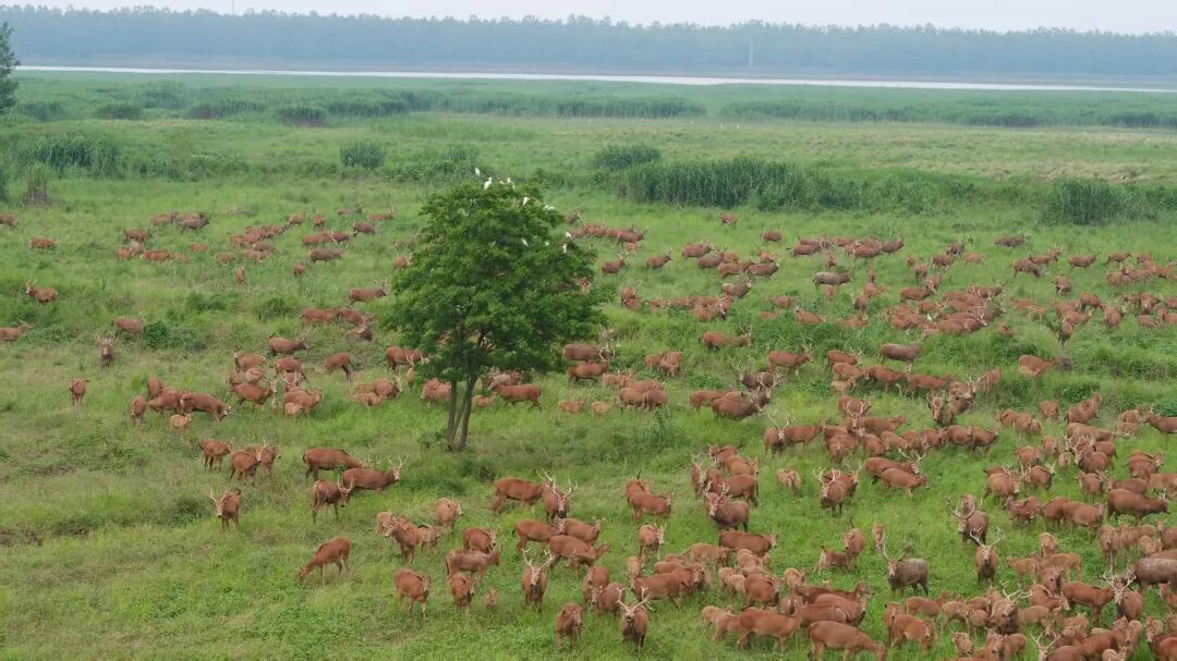 数千余头麋鹿正悠闲徜徉于青绿之间